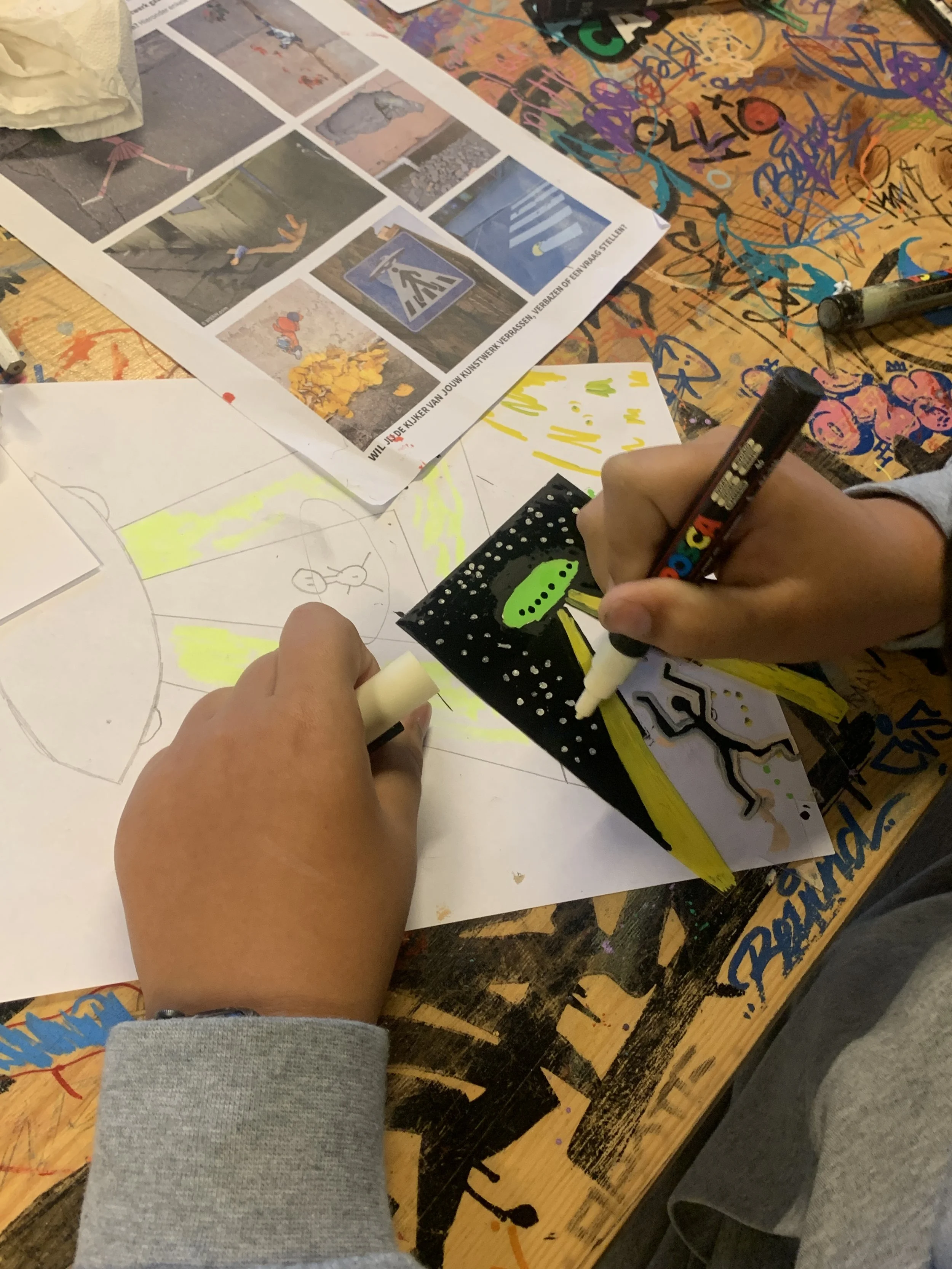 small piece of art transform its surroundings? Will it surprise, provoke, or raise questions for the viewer? In this way, students are introduced to street art and experiment with a variety of materials.